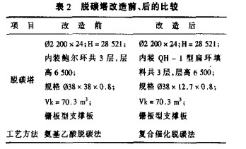 扁環(huán)填料已在數(shù) 10 項(xiàng)中小化肥廠凈化系統(tǒng)的技術(shù)改造中得到成功的應(yīng)用, 并開(kāi)始在大化肥裝置的改造中應(yīng)用。以浩良河化肥廠脫碳塔的改造為例, 原設(shè)計(jì)合成氨生產(chǎn)能力為 5 萬(wàn) t/ a, 原料為重油, 變換氣中 CO2 含量高達(dá) 32. 2% 。 1996 年, 以脫碳系統(tǒng)的改造為重點(diǎn), 確定運(yùn)用南化公司化工研究院的復(fù)合催化法脫碳及清華大學(xué)開(kāi)發(fā)的QH- 1 型扁環(huán)填料技術(shù)。脫碳塔塔徑為 2 200, 原設(shè)計(jì)內(nèi)裝拉西瓷環(huán), 后改為 38 金屬鮑爾環(huán), 但仍遠(yuǎn)不能滿足技術(shù)改造要求。經(jīng)計(jì)算, 選用 38 QH- 1 型扁環(huán)填料后滿足了生產(chǎn)要求, 改造于 1997 年大修實(shí)施, 裝置投入運(yùn)行后取得成功。表 2 列出了脫碳塔改造前、后數(shù)據(jù)對(duì)比。
