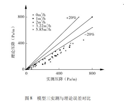 模型一所獲得的理論值與實驗值相比較為接近,誤差在20%以內(nèi),而模型二的理論壓降與實驗結果相比普遍偏大,在流量較小及較大區(qū)域時理論壓降與實測壓降相比已超出20%,模型三的理論結果則普遍小于實測值,誤差均已超出20%