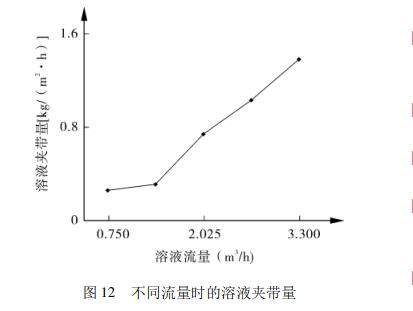 的變化趨勢,在設計過程中可忽略,根據(jù)圖12、13可知當溶液流量一定調(diào)節(jié)風機頻率時隨著填料塔內(nèi)風速出口空氣中液體夾帶量隨之增加,圖12表明隨著溶液流量的增加同風機在同一頻率下運行時空氣中夾帶的溶液量幾乎呈線性增加,雖然風量減小可減少液體夾帶量但兩者綜合作用的結果是隨著溶液流量的增加液體夾帶量線性急劇增加,因此在空調(diào)系統(tǒng)必須加裝除沫裝置溶液的夾帶。