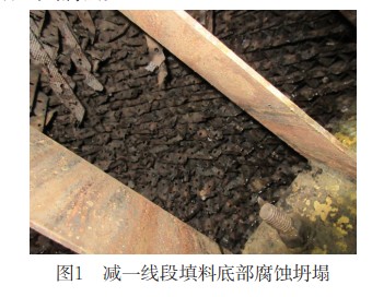 大檢修期間,對減壓塔進(jìn)行了開蓋檢查,發(fā)現(xiàn)減壓塔頂部、底部兩段填料存在大面積腐蝕、坍塌,塔內(nèi)壁也出現(xiàn)輕微坑蝕。
